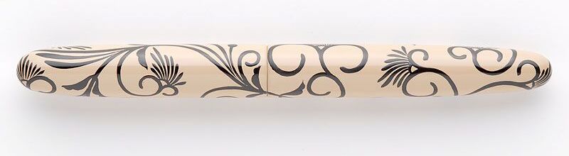 Drawing using colored urushi lacquer to the entire surface of pen. The motif is one scene inspired by the many heroic stories of Minamoto no Tametomo, known as a master archer. Arrows are drawn on the cover using silver Taka Maki-e. The dynamic activities of Minamoto no Tametomo are expressed lively with a variety of colored urushi lacquer on a white urushi lacquer base.