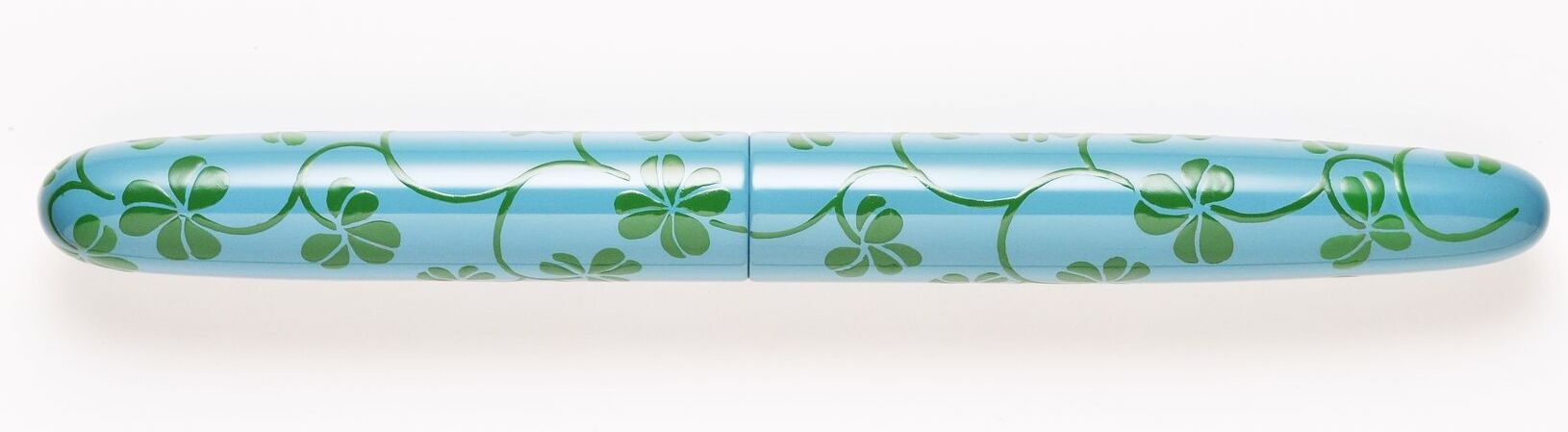 The clover arabesque pattern is drawn with green lacquer on the light blue base. The image of a fresh green clover stretching toward the blue sky expresses a refreshing youthfulness and cuteness.