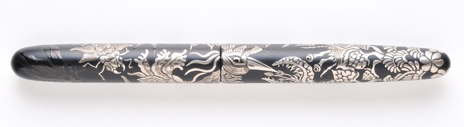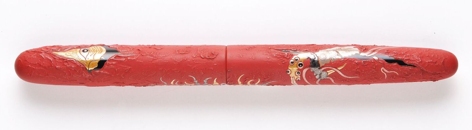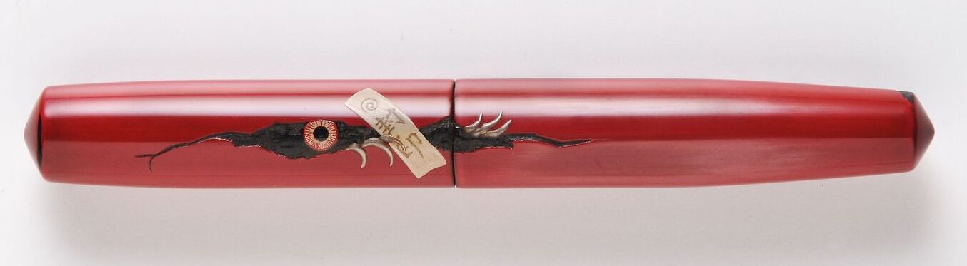 The image is one of a monster breaking free from being locked up and checking to see if it’s alright to emerge to the outside world. This pen has been finished with what is known as “Shu Koboku”. The irregularities in the surface are first made using Urushi. Another thin layer of Urushi is then added. It is finished with Fuki-Urushi after sprinkling and affixing a Shu(red) pigment.