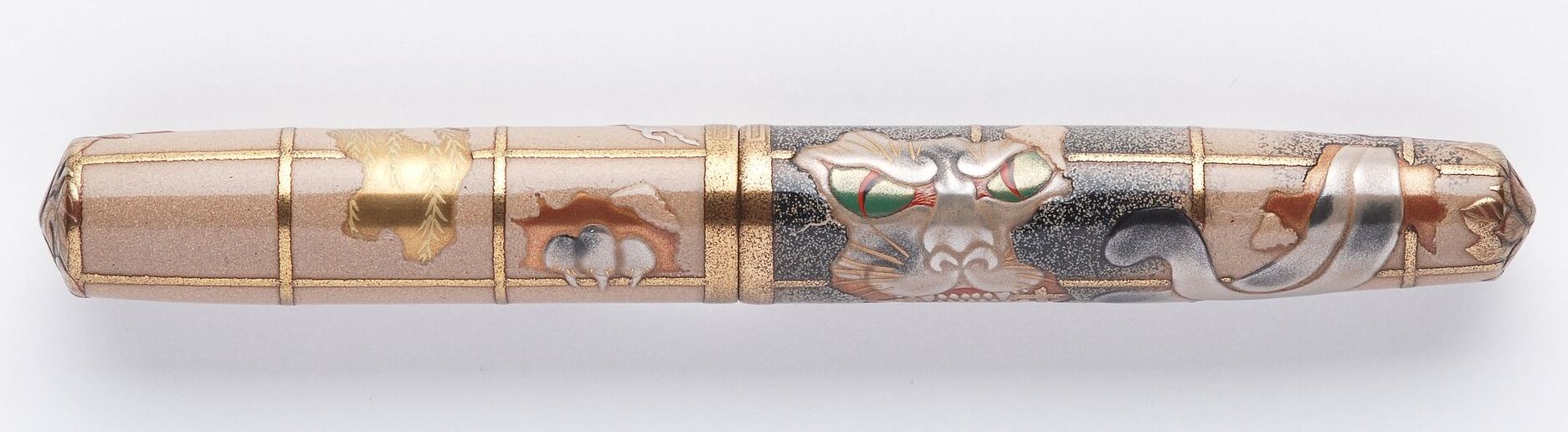 The image is one of a monster breaking free from being locked up and checking to see if it’s alright to emerge to the outside world. This pen has been finished with what is known as “Shu Koboku”. The irregularities in the surface are first made using Urushi. Another thin layer of Urushi is then added. It is finished with Fuki-Urushi after sprinkling and affixing a Shu(red) pigment.