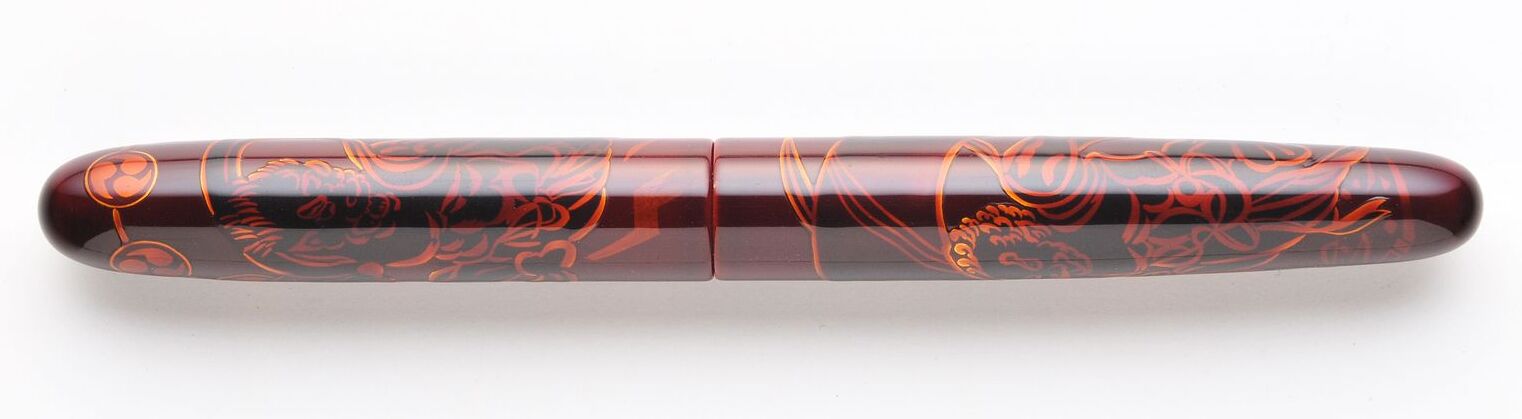 江戸時代の浮世絵師である歌川国芳の障子をバリバリと破って来る怖い猫を参考に製作しました。キャップをしている時には破れた障子から柳が綺麗に見えますが、キャップを外すと骸骨が出てくる趣向を凝らした作品です。化け猫の様な怖いモチーフが全面に出ている反面、全体がユーモラスな出来栄えで、可愛さだけでない猫の奥深い魅力がペンに詰まった作品にすることが出来ました。