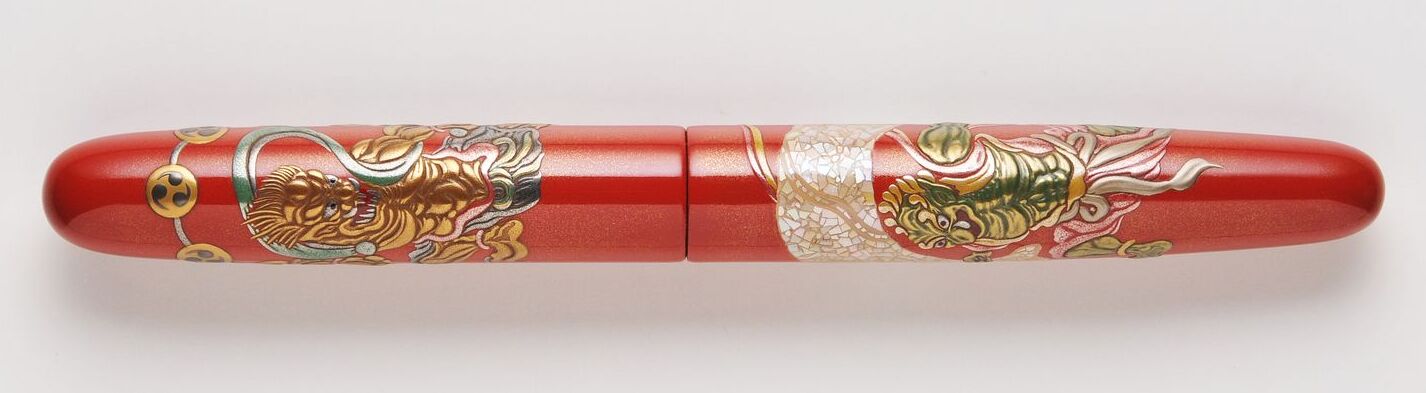 The image is one of a monster breaking free from being locked up and checking to see if it’s alright to emerge to the outside world. This pen has been finished with what is known as “Shu Koboku”. The irregularities in the surface are first made using Urushi. Another thin layer of Urushi is then added. It is finished with Fuki-Urushi after sprinkling and affixing a Shu(red) pigment.